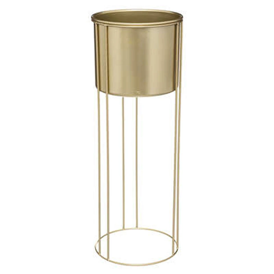 Atmosphera Plantenpotten set, goudkleurig. Deze bloempotten set van 2 stuks hebben een hoge metalen standaard. De standaarden en de kunststof potten zijn goudkleurig. De standaard van 41 cm hoog heeft een diameter plantenpot van 18 cm en de standaard van 58 cm heeft een plantenpot met diameter 21 cm. Bloempotten verhogers.