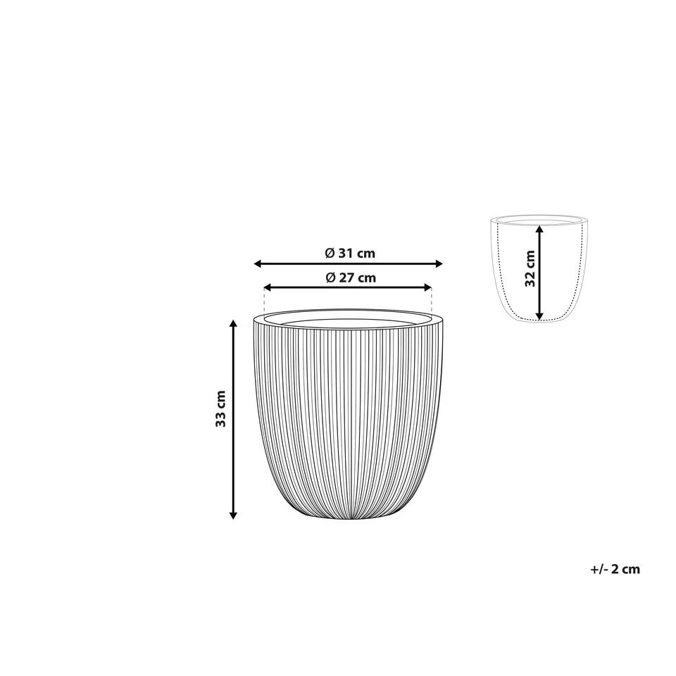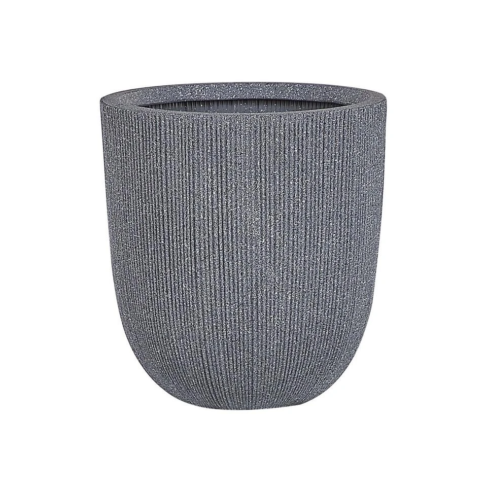 Grijze bloempot met gegroefde structuur. Bloempotten met planten geven vaak de finishing touch aan een interieur of de terrasopstelling. Deze ronde plantenpot met krijtstreep in een altijd mooie grijze kleur is een ideale oplossing voor zowel grote planten als voor tal van kleinere bloemen. Een natuurlijke compositie met deze bloempotten barst van de natuurlijke sfeer en geeft een decoratief karakter aan elk terras, balkon of zelfs een woonkamer. De weersbestendigheid van de polyresin zorgt ervoor dat de plantenbak er altijd verzorgd uitziet.