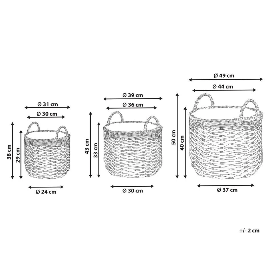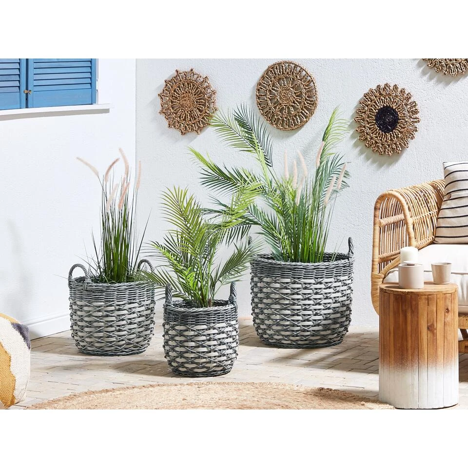 3 plantenpotten voor buiten met decoratief weefsel. Deze set van 3 mooie bloemenmanden is het perfecte hoogtepunt voor elke plant, groot of klein. Ze zijn gemaakt van duurzaam PE rotan en zijn verkrijgbaar in een tijdloze combinatie van grijs en wit. De potten hebben een mooie weving voor een klassieke uitstraling, terwijl de handvatten ervoor zorgen dat ze gemakkelijk te verplaatsen zijn. Elke mand is bekleed met een synthetisch materiaal om de vloer te beschermen tegen aarde en water. Of ze nu in de woonkamer of in de tuin staan, ze zullen zeker een prachtige aanvulling zijn op elke moderne omgeving.