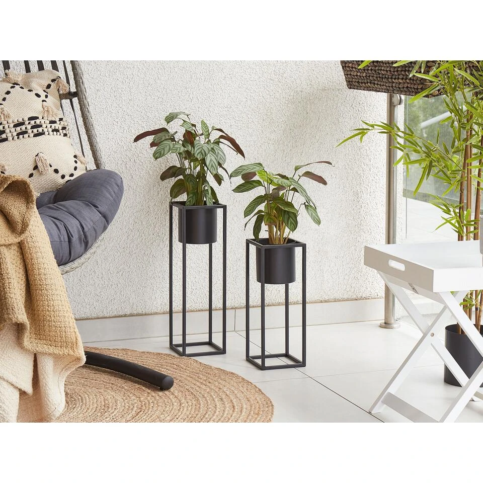 Decoratieve staande plantenbak. Deze prachtige plantenstandaard is een onmisbaar accessoire voor iedereen die van groen en een moderne inrichting houdt. Naast het benadrukken van je planten, zal het ook een geweldige decoratie voor binnen of buiten zijn. Deze staande plantenbak is gemaakt van duurzaam ijzer in de kleur zwart. De bloempot op een standaard is gemakkelijk te onderhouden en lichtgewicht, dit stuk is ideaal voor zowel natuurlijke als kunstmatige planten.