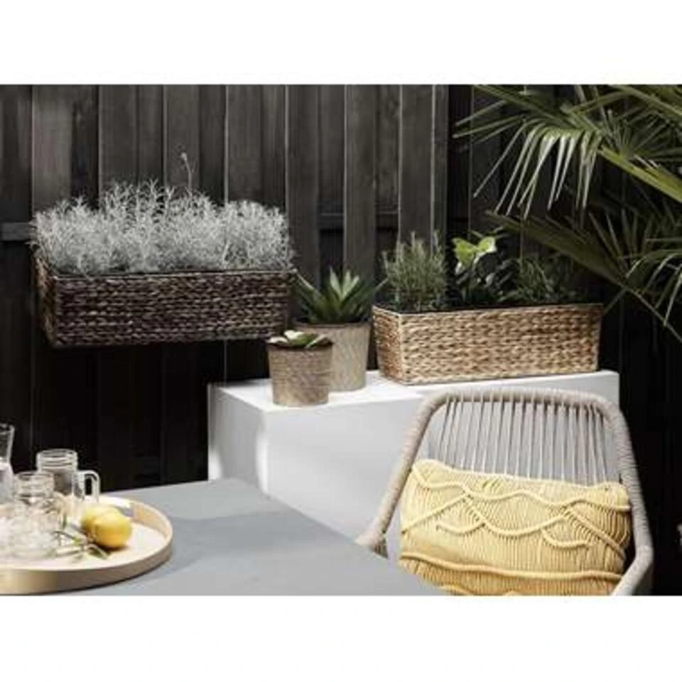 Rechthoekige balkonbak van waterhyacint voor binnen en buiten. Bevestig deze hangende plantenbak aan de buitenkant van je balkonreling om je zitplek te omringen met een zomeroase en te genieten van een groen uitzicht. De bakken zijn uitgerust met twee maatvaste inzetstukken voor beplanting, die de kuip beschermen tegen water en wortelgroei. De handgrepen kunnen indien nodig eenvoudig worden verwijderd, zodat je ze ook in de vensterbank kunt gebruiken. Omdat de bloembak is gemaakt van natuurlijke, gedroogde waterhyacint, is hij UV- en weerbestendig, bijzonder slijtvast, zeer duurzaam en ongedierte- en schimmelbestendig.