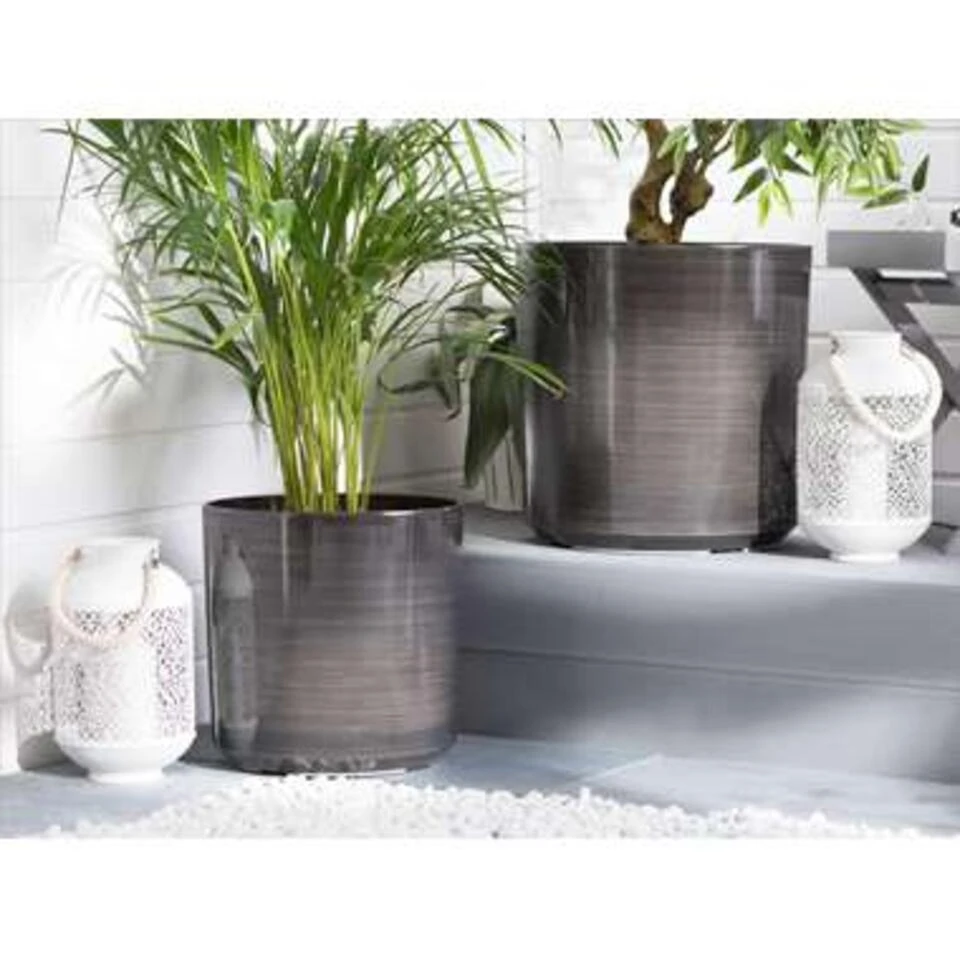 Grijze bloempot in cilindervorm. Het subtiele streeppatroon, de donkere, grijze kleur en de glanzende afwerking maken deze bloempot een blikvanger – zowel thuis als in de tuin. Dankzij de weerbestendige materialen kun je dit accessoire buiten gebruiken, ongeacht het seizoen.