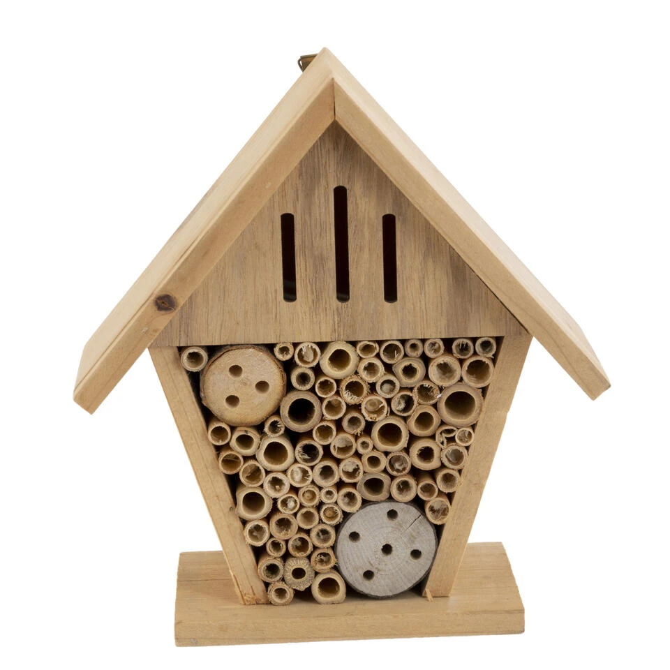 Insectenhotel huisje 19 cm. Een insecten hotel huisje voor bijen, vlinders, lieveheersbeestjes, kevers, duizendpoten en andere insecten. In dit insectenhotel kan het ongedierte uitrusten/overwinteren. Afmeting: ca. 18 x 8 x 19 cm. Materiaal: sparrenhout en draad. Met ophangsysteem. Dit diervriendelijke tuindecoratie accessoires bijenhuis/vlinderhuis insectenhotel draagt bij aan het ecosysteem en de biodiversiteit in uw tuin. Een habitat voor bestuivers en natuurlijke ongediertebestrijders. Een must-have voor tuinliefhebbers/natuurliefhebbers.