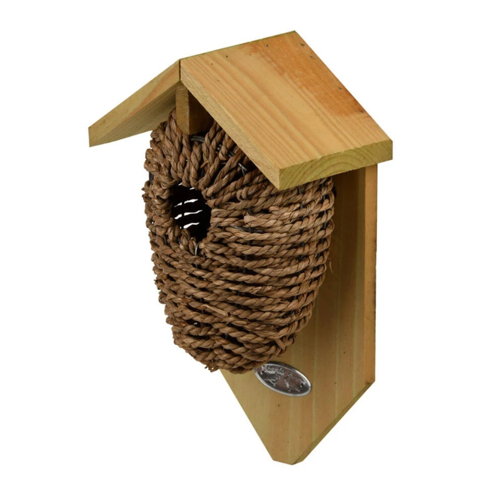 Een houten vogelhuisje/nestkastje/nestbuidel aan houten houder. Deze nestbuidel is geschikt voor o.a. de Winterkoning. Plaats de nestbuidel aan een boom of muur, op een hoogte tot max. 2 m, op een goed verborgen plek tussen dicht struikgewas of klimopplanten, op een rustige en enigszins beschutte plaats, dus niet pal in de zon of op de regenzijde, met een vrije aanvliegroute voor de vogel. Afmeting: 10 x 15 x 26 cm. Formaat gat diameter: ca. 3 cm. Materiaal: zeegras/hout. Met ophangplaatje in het hout aan de bovenzijde (bevestigingsmateriaal niet inbegrepen). Diervriendelijke tuindecoratie accessoires vogelhuisje/nestkastje/nestbuidel. Een must-have voor natuurliefhebbers.