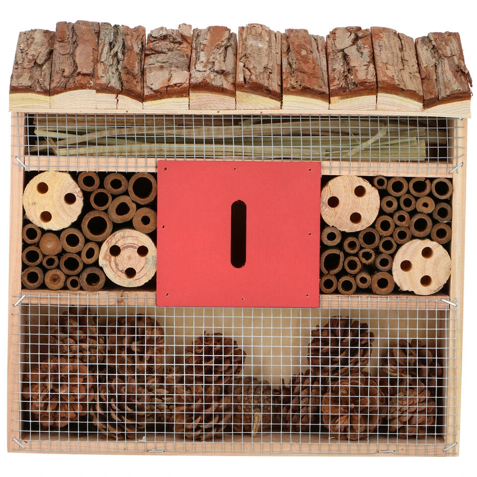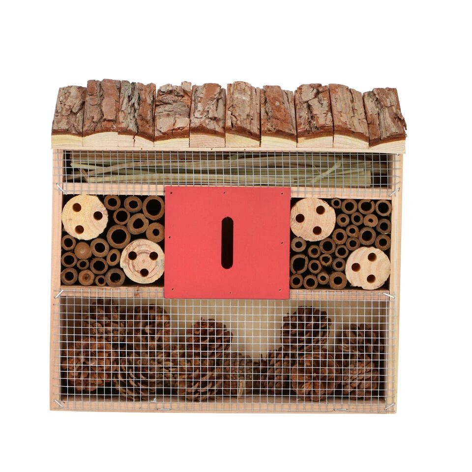 Een insecten hotel huisje met dakje van schors en rood middenvak voor vlinders, lieveheersbeestjes, kevers, duizendpoten, bijen en andere insecten. In dit insectenhotel kan het ongedierte uitrusten/overwinteren. Afmeting: ca. 28 x 10 x 30 cm. Materiaal: hout. Met ophangdraadje aan de bovenkant. Dit diervriendelijke tuindecoratie accessoires bijenhuis/vlinderhuis insectenhotel draagt bij aan het ecosysteem en de biodiversiteit in uw tuin. Een habitat voor bestuivers en natuurlijke ongediertebestrijders. Een must-have voor tuinliefhebbers/natuurliefhebbers.