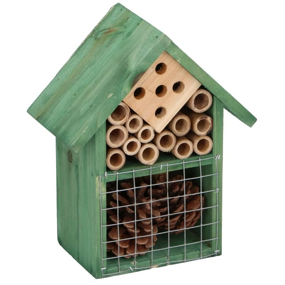 Een groen insecten hotel huisje voor vlinders, lieveheersbeestjes, kevers, duizendpoten, bijen et cetera. In dit insectenhotel kan het ongedierte uitrusten/overwinteren. Afmeting: ca. 16 x 9 x 19 cm. Materiaal: hout. Met ophangoogje. Dit diervriendelijke tuindecoratie accessoires bijenhuis/vlinderhuis insectenhotel draagt bij aan het ecosysteem en de biodiversiteit in uw tuin. Een habitat voor bestuivers en natuurlijke ongediertebestrijders. Een must-have voor tuinliefhebbers/natuurliefhebbers.