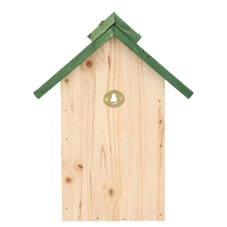 Een houten vogelhuisje/nestkastje met een afneembaar groen dak. Een leuk huisje voor kleine vogeltjes zoals: pimpel/koolmeesjes, musjes en andere kleine vogels rondom het huis. Afmeting: ca. 24 x 18 x 14 cm. Materiaal: hout. Met ophangring aan de achterkant. Diervriendelijke tuindecoratie accessoires vogelhuisje/nestkastje. Een must-have voor natuurliefhebbers.
