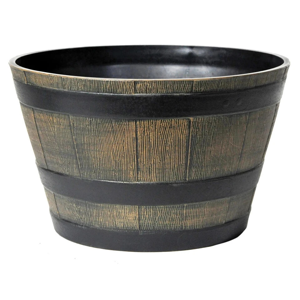 De bloempot/plantenpot uit de Barrel Planter serie gemaakt van kunststof. Het vat heeft een natuurlijke uitstraling doordat het ontwerp is geinspireerd op een houten vat. De kleur van de plantenbak is bruin met twee zwarte randen aan de buitenkant. Het houtmotief van de pot zorgt voor een warme en natuurlijke sfeer in de omgeving waar het wordt geplaatst. Niet alleen te gebruiken voor bloemen/planten, maar ook als decoratie of als minivijvertje voor op uw terras. Afmetingen: Diameter 44 cm x Hoogte 26 cm.