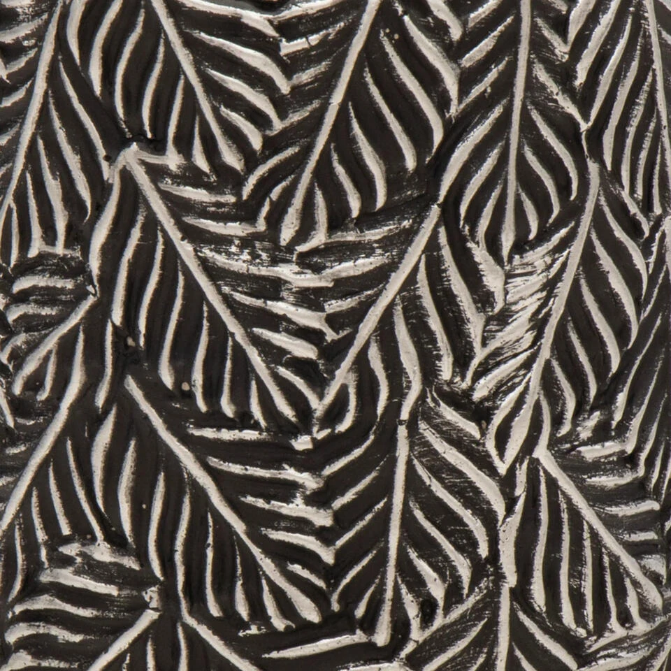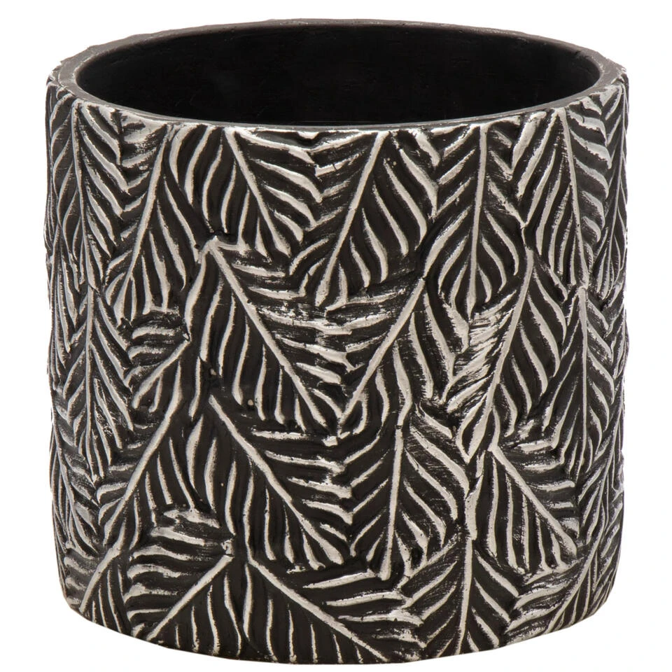 Plantenpot/bloempot gemaakt van keramiek in de kleur antraciet grijs/zilver met aan de buitenzijde een bladmotief print. Afmetingen: Diameter 14 cm en Hoogte 13 cm. Vorm: cilinder. Stijlvolle bloempot uit de Adana Cylinder serie voor binnen gebruik is een schitterende toevoeging aan uw interieur.