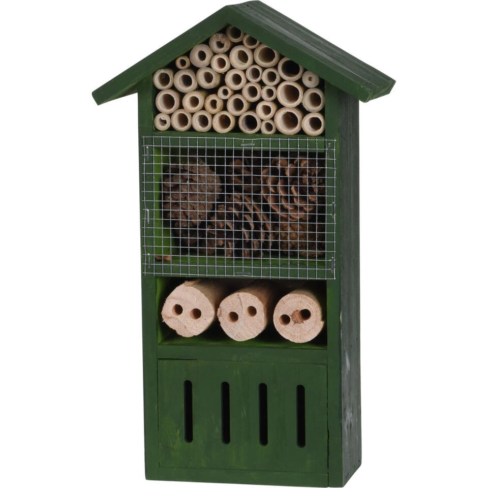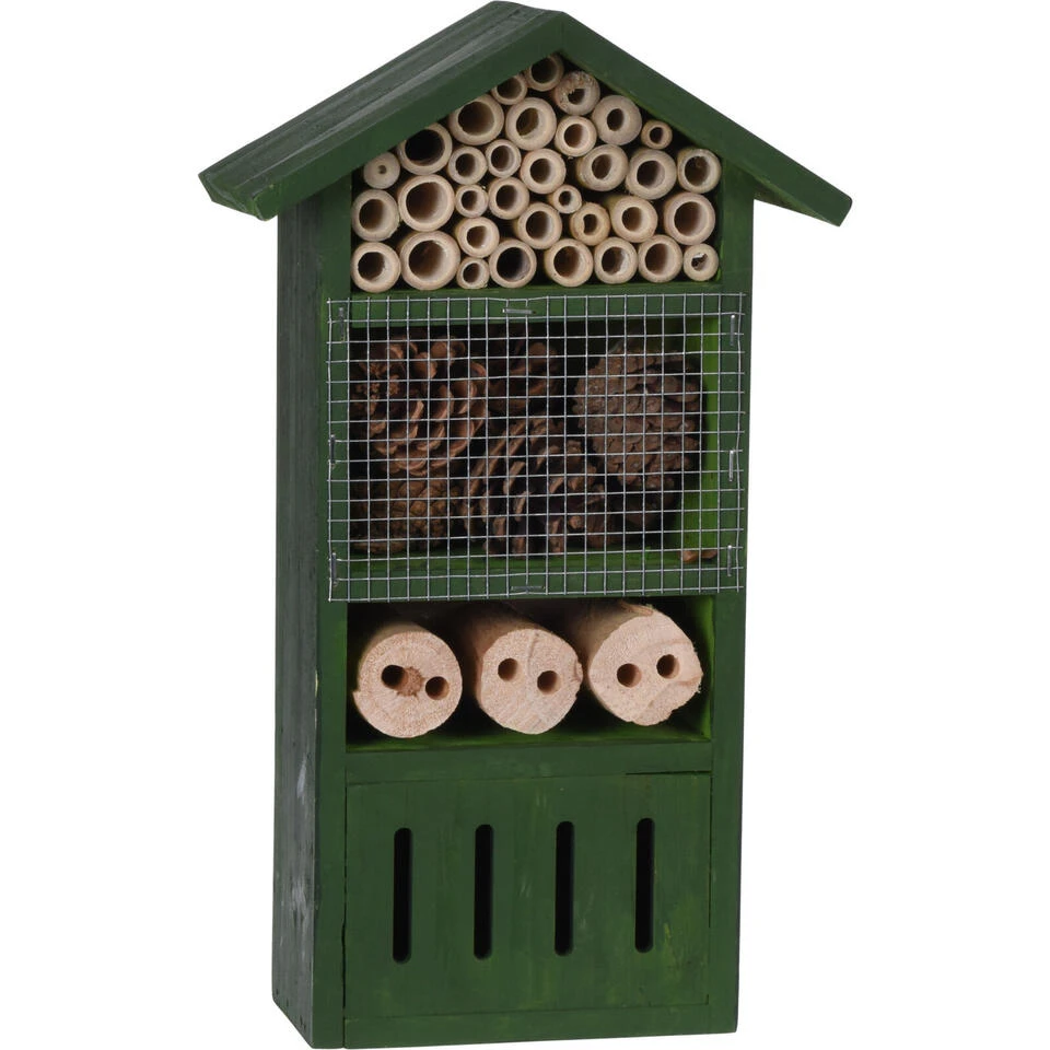 Insectenhotel groen huisje 33 cm. Een insecten hotel huisje voor bijen, vlinders, lieveheersbeestjes, kevers, duizendpoten en andere insecten. In dit insectenhotel kan het ongedierte uitrusten/overwinteren. Afmeting: ca. 31 x 10 x 33 cm. Materiaal: sparrenhout en draad. Met ophangsysteem. Dit diervriendelijke tuindecoratie accessoires bijenhuis/vlinderhuis insectenhotel draagt bij aan het ecosysteem en de biodiversiteit in uw tuin. Een habitat voor bestuivers en natuurlijke ongediertebestrijders. Een must-have voor tuinliefhebbers/natuurliefhebbers.