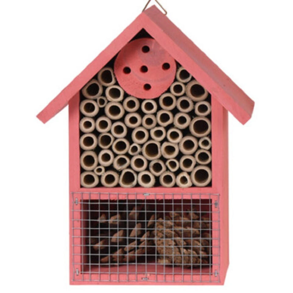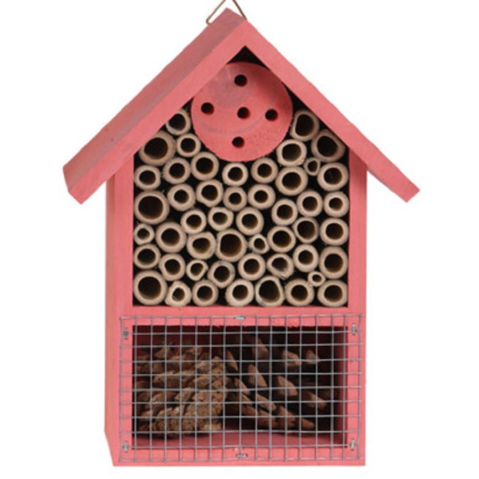 Een roze insecten hotel huisje voor vlinders, lieveheersbeestjes, kevers, duizendpoten, bijen et cetera. In dit insectenhotel kan het ongedierte uitrusten/overwinteren. Afmeting: ca. 15 x 8 x 20 cm. Materiaal: dennenhout. Met ophangoogje. Dit diervriendelijke tuindecoratie accessoires bijenhuis/vlinderhuis insectenhotel draagt bij aan het ecosysteem en de biodiversiteit in uw tuin. Een habitat voor bestuivers en natuurlijke ongediertebestrijders. Een must-have voor tuinliefhebbers/natuurliefhebbers.