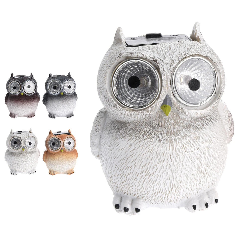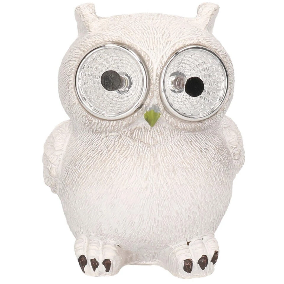Een uil tuinbeeldje met LED verlichting, voor in uw tuin. De oogjes van het uiltje zijn lichtjes. De lampjes werken op zonne-energie en laden zichzelf gedurende de dag op.