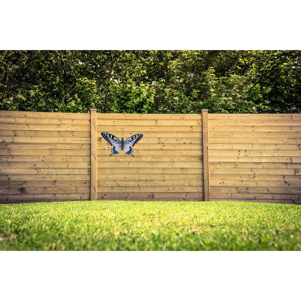 Een grijsblauwe met zwarte vlinder, geschikt voor decoratie in uw tuin of aan uw schutting. Met ophangoogje. Afmeting: ca. 44 x 31 cm. Materiaal: metaal. Tuindecoratie muur/schutting ophang vlinders van metaal.