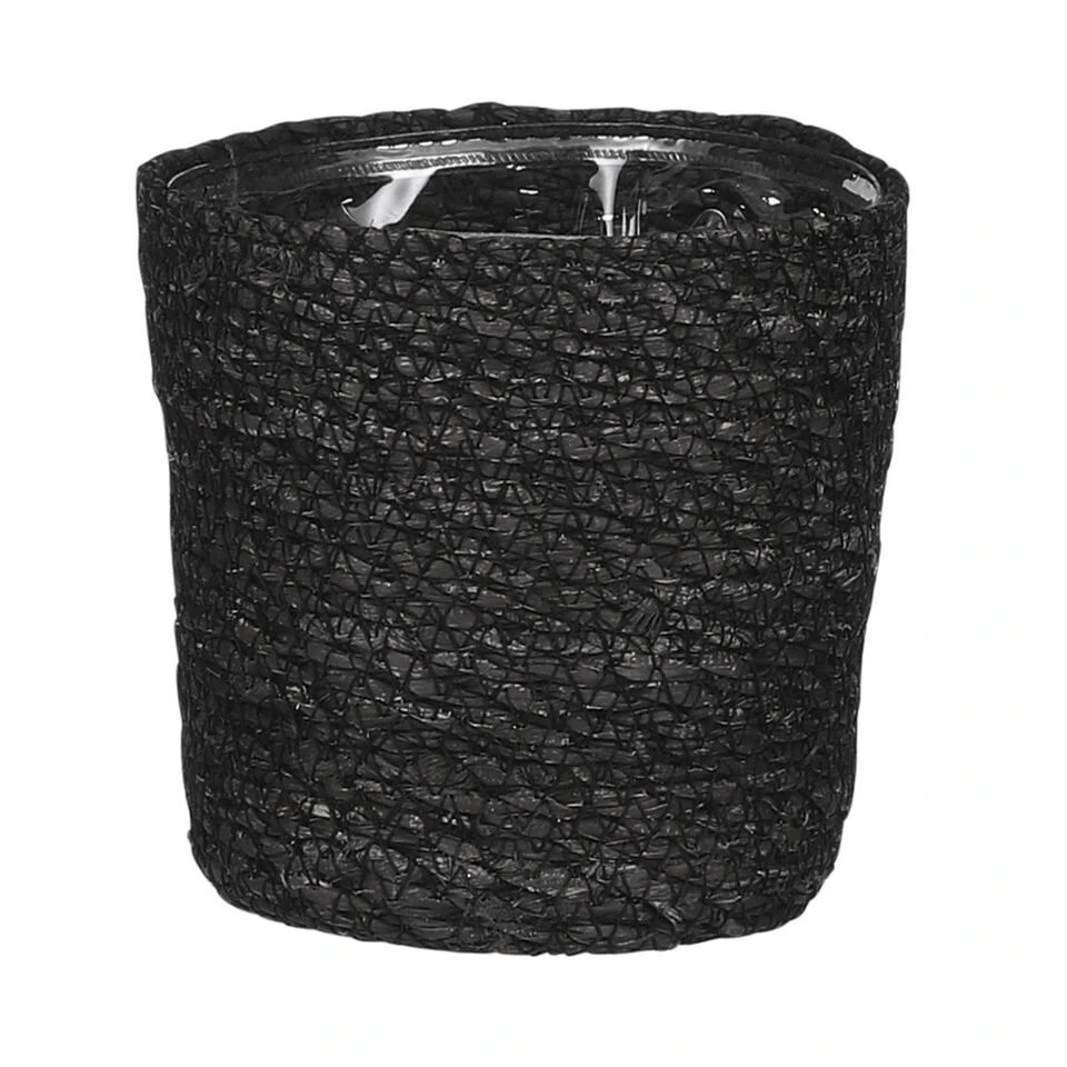 Naturel zwart kleur rotan planten pot mand van gedraaid jute/touw/riet/zeegras van 12 cm hoogte en 12 cm diameter(buitenzijde). Voor de binnenmaat trek je 2 cm af. Mooie rotan jute manden/mandjes voor bloemen, bloemstukjes en planten met plastic aan de binnenkant zodat het water er niet door gaat. De ronde rieten mand heeft geen gaatjes aan de onderkant.