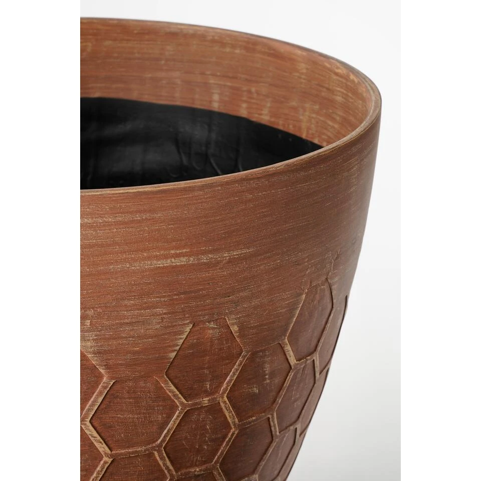 Deze Bravo bloempot van Mica Decorations heeft alle kenmerken van een stenen bloempot, op één ding na: het gewicht. De pot is namelijk gemaakt van lichtgewicht kunststof. De koperkleurige pot voor buiten valt op door de stijlvolle, honingraat structuur. Het voordeel is dat hij zowel binnen als buiten te gebruiken is. De pot is namelijk UV- en vorstbestendig. Leuk als stoere toevoeging voor in de woonkamer of voor buiten op het terras! Voor buitengebruik is het wel verstandig om het aangegeven drainage gat in de bodem te doorboren. Dit zorgt voor een goede afwatering. De Bravo bloempotten zijn verkrijgbaar in verschillende kleuren en maten. Deze koperkleurige bloempot is 40 cm hoog en heeft een diameter van 45 cm.