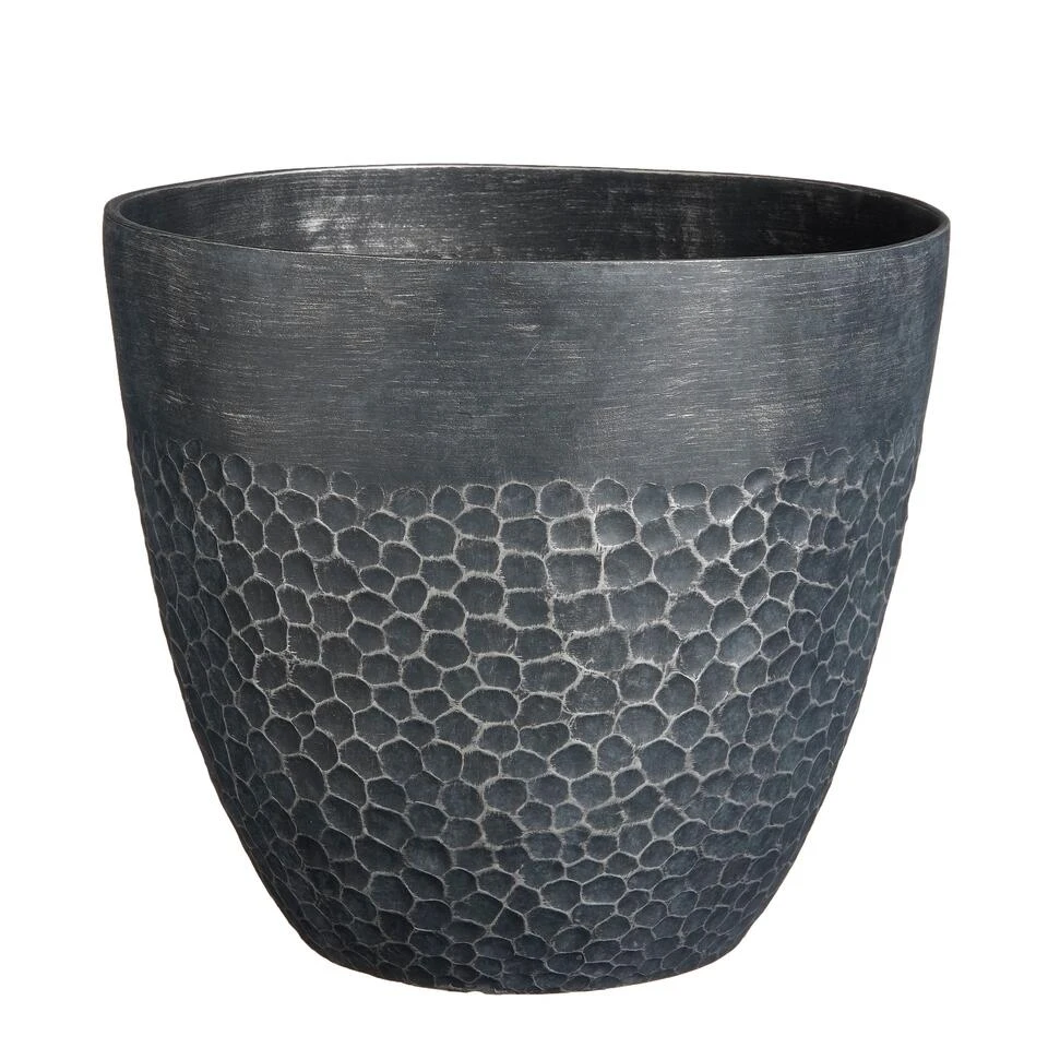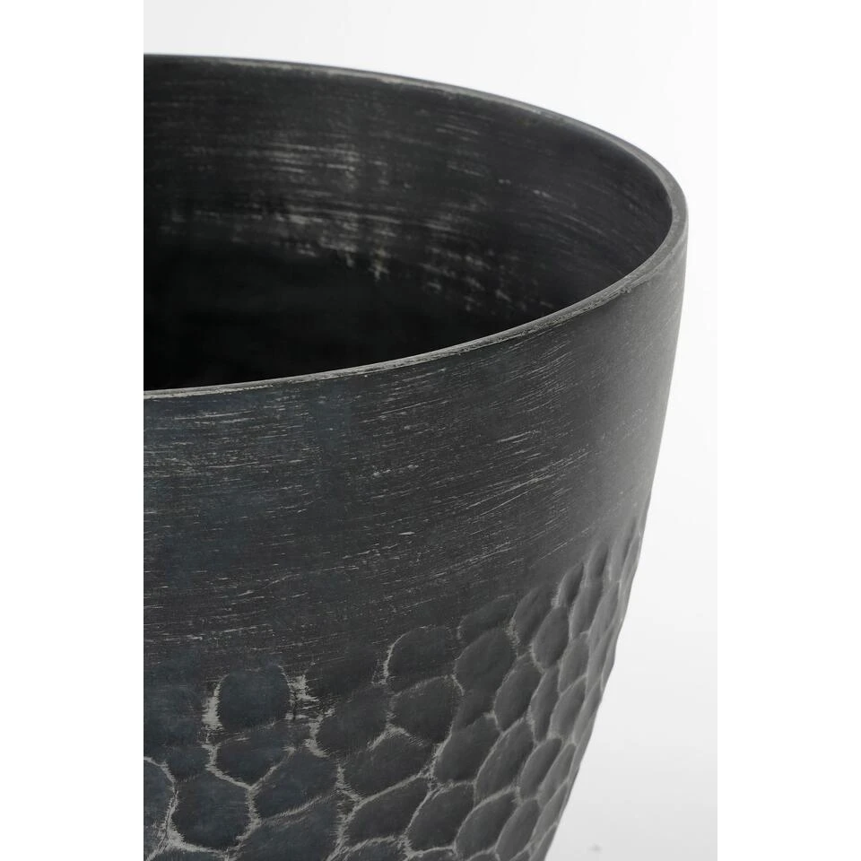 Deze Bravo bloempot van Mica Decorations heeft alle kenmerken van een stenen bloempot, op één ding na: het gewicht. De pot is namelijk gemaakt van lichtgewicht kunststof. De zwarte pot voor buiten valt op door de stoere, gehamerde structuur. Het voordeel is dat hij zowel binnen als buiten te gebruiken is. De pot is namelijk UV- en vorstbestendig. Leuk als stoere toevoeging voor in de woonkamer of voor buiten op het terras! Voor buitengebruik is het wel verstandig om het aangegeven drainage gat in de bodem te doorboren. Dit zorgt voor een goede afwatering. De Bravo bloempotten zijn verkrijgbaar in verschillende kleuren en maten. Deze zwarte bloempot is 40 cm hoog en heeft een diameter van 45 cm.