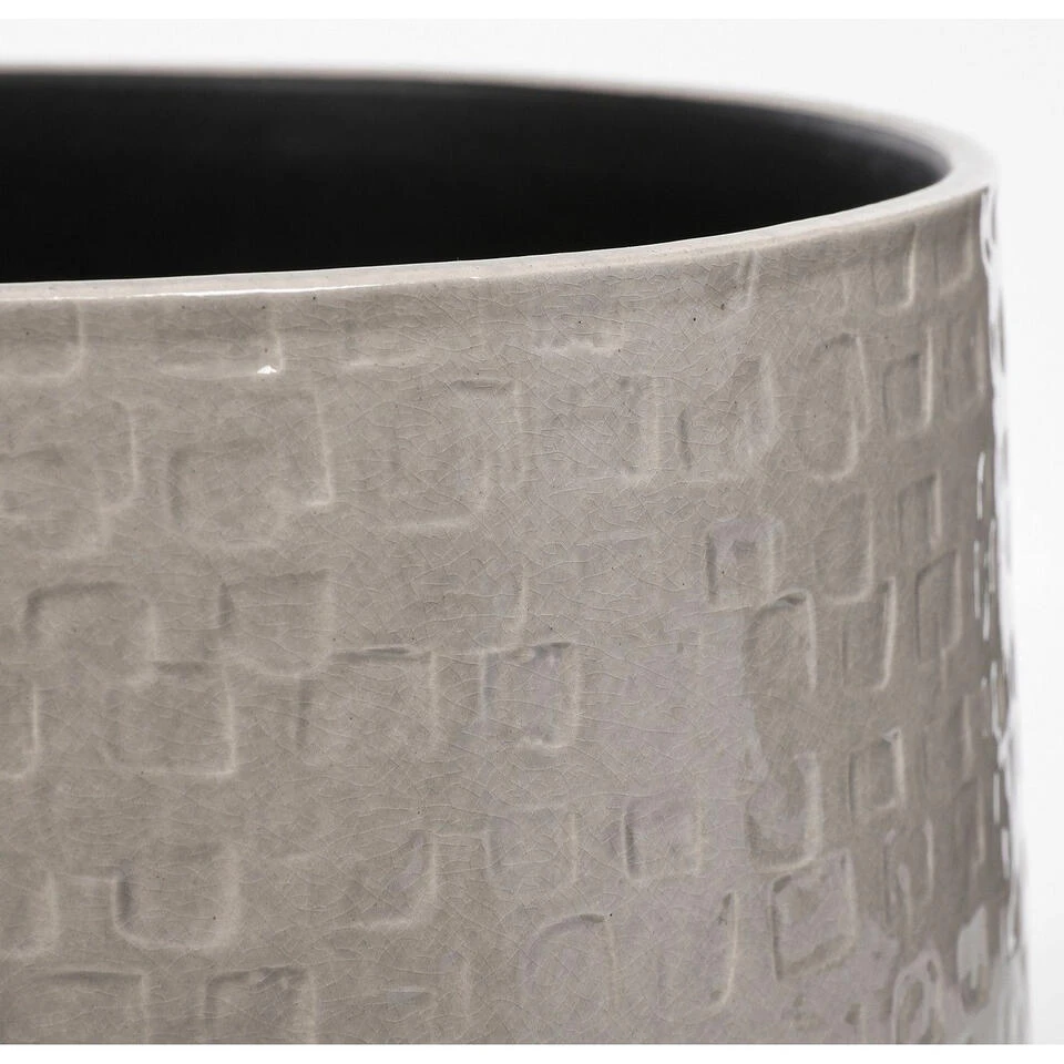 De mooie afwerking en de glanzende finish maken de Floyd bloempot van Mica Decorations echt een aanwinst voor het interieur. De pot wordt gemaakt van keramiek en is afkomstig uit Portugal. Hier wordt met veel zorg en aandacht met de hand een subtiel reliëf patroon aangebracht. Elk item is uniek! Door de hoogglans finish komt deze mooie afwerking extra goed uit de verf. Zeker in combinatie met de moderne, grijze kleur. Zo weet deze pot in elk huis wel een plekje te vinden! De Floyd serie bestaat uit potten, schalen en vazen in verschillende kleuren en maten die goed met elkaar te combineren zijn. Deze bloempot is grijs en heeft een afmeting van H23,5 x Ø28 cm.