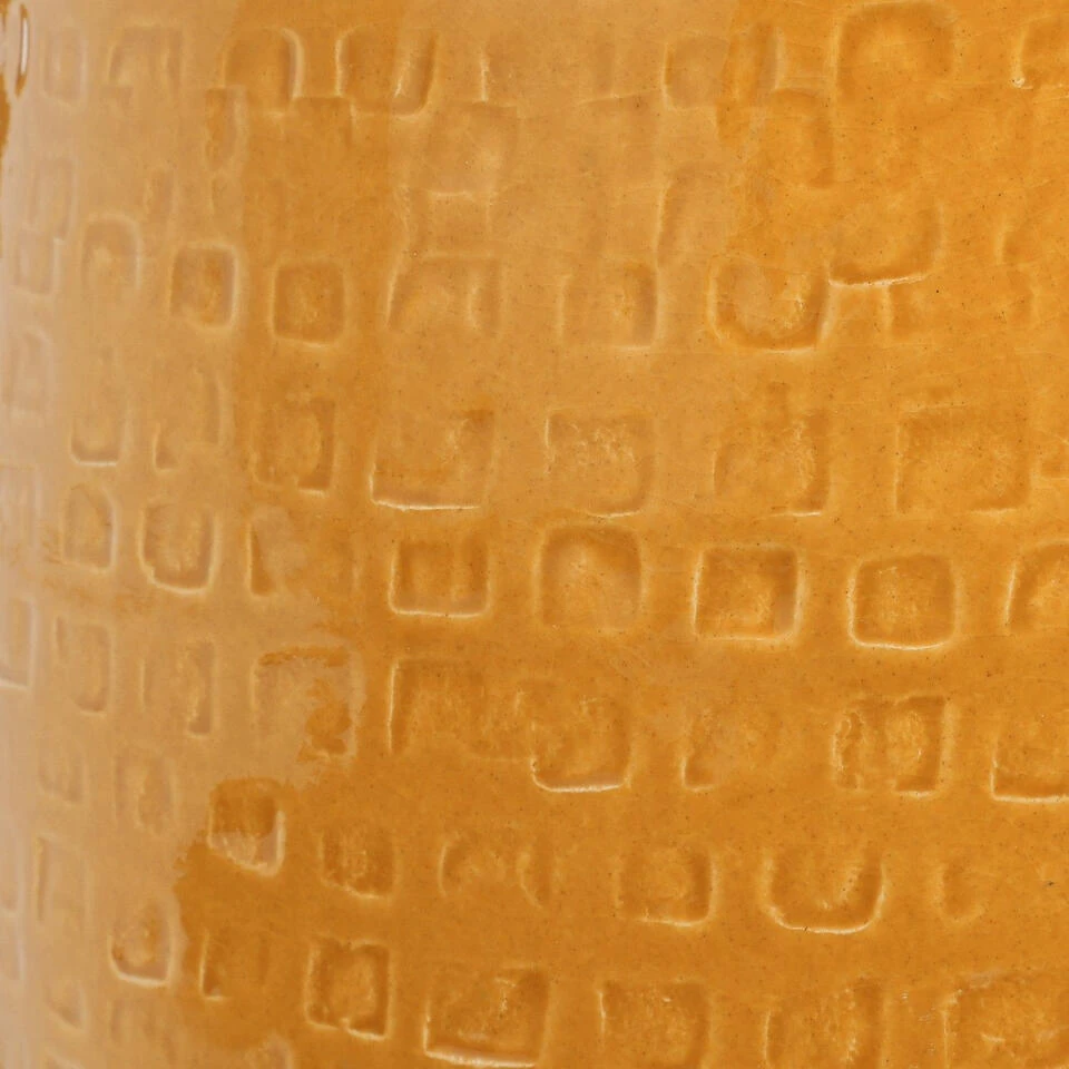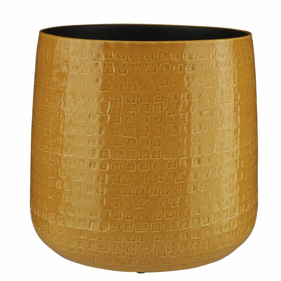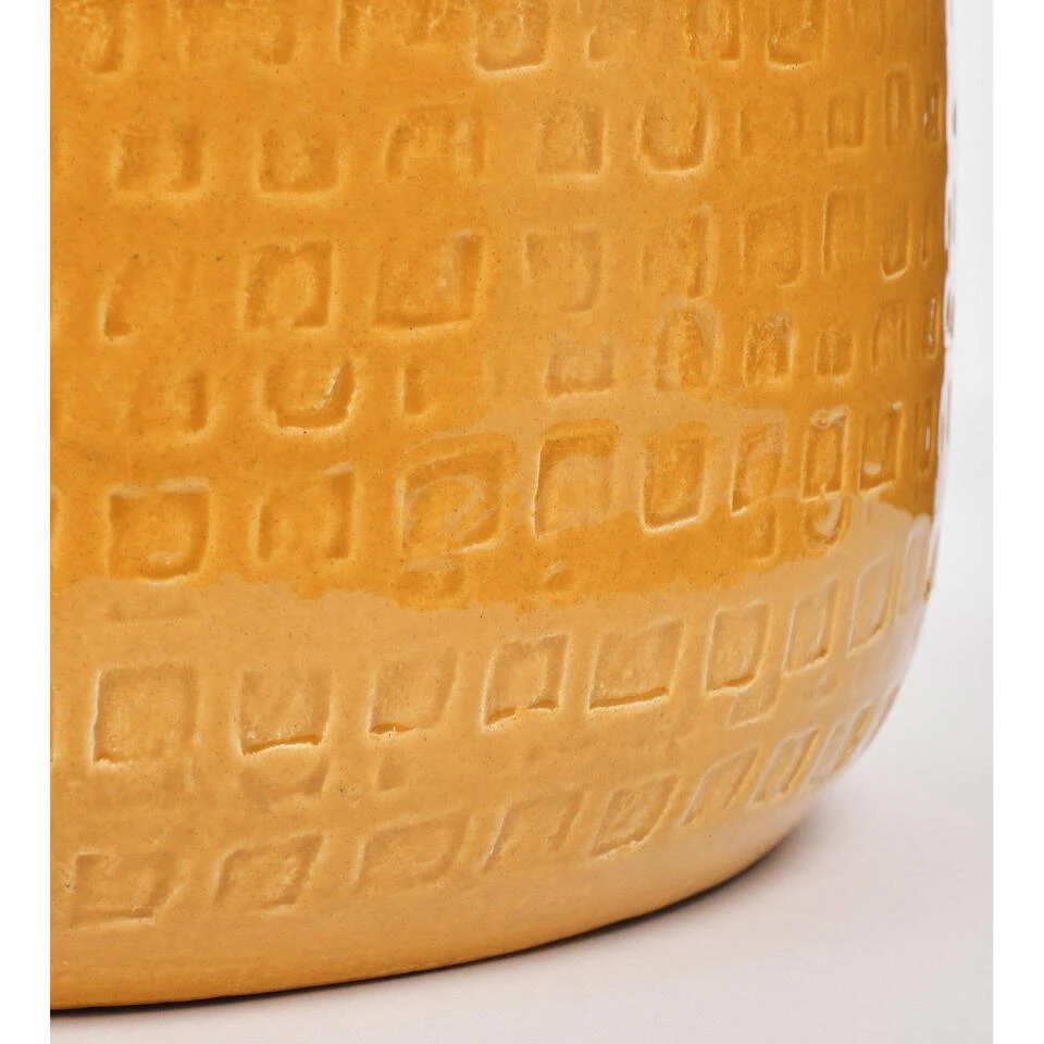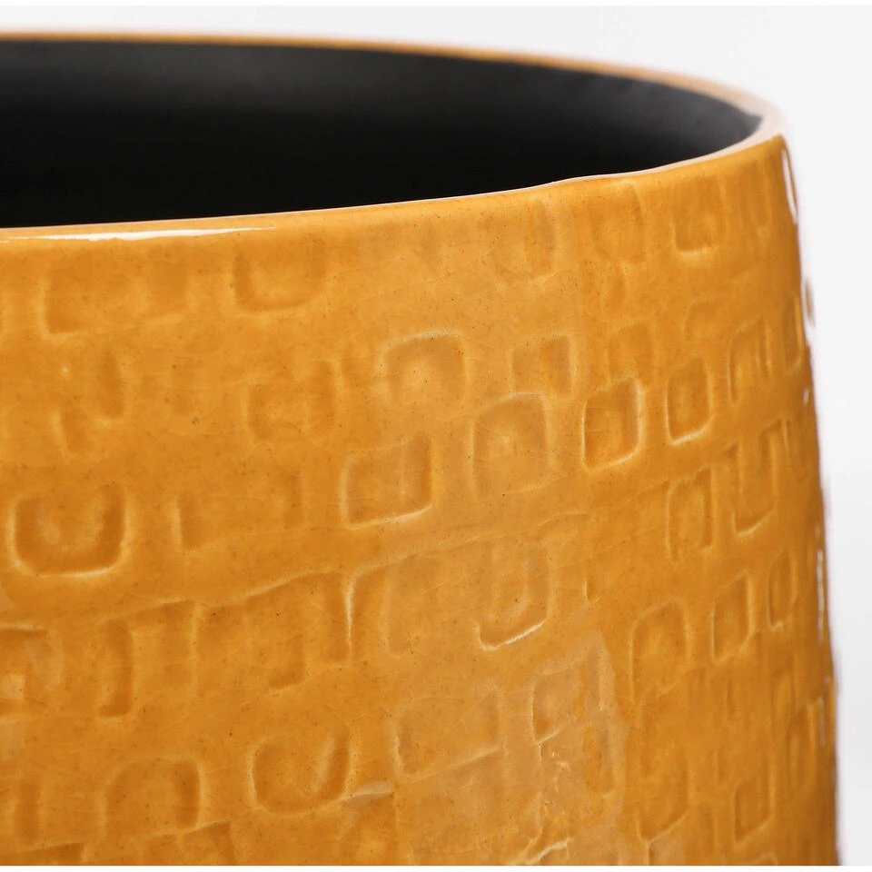 Plantenpot/bloempot van keramiek in de kleur okergeel met een mooi relief patroon. Diameter 32 cm en hoogte 30 cm. Stijlvolle bloempotten voor binnen gebruik met een glanzende finish. Serie: Floyd. Het prachtige gedrukte patroon aan de buitenzijde is met de hand gemaakt in Portugal. Derhalve is geen pot exact hetzelfde en hebben de bloempotten een echt karakter.