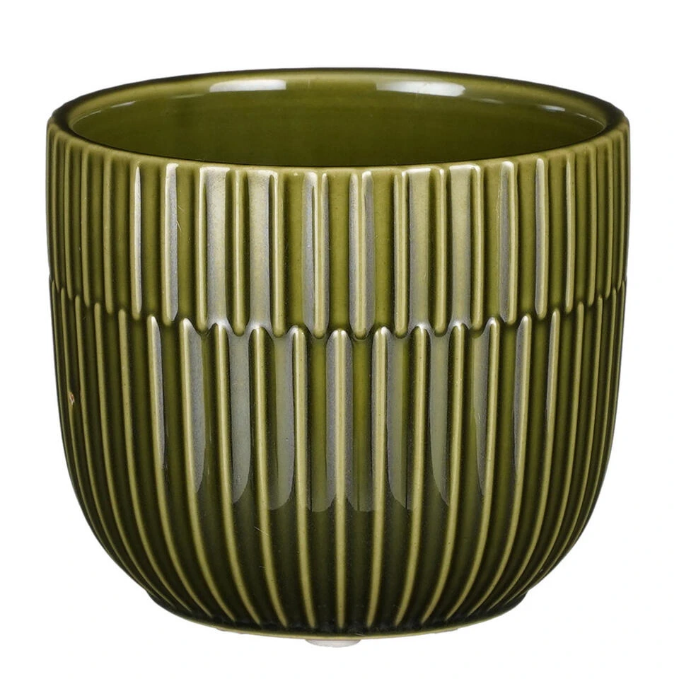 Plantenpot/bloempot van keramiek in de kleur glans donkergroen met een mooi verticale strepen patroon. Diameter 11 cm en hoogte 9 cm. Stijlvolle bloempotten voor binnen gebruik. Serie: Sara. De stijlvolle pot met het prachtige patroon aan de buitenzijde is met de hand gemaakt in Portugal. Derhalve is geen pot exact hetzelfde en hebben de bloempotten een echt karakter. Tip: zet een schotel onder de pot om eventueel lekken tegen te gaan. Potten van steen zijn niet 100% waterdicht.