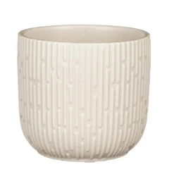 Plantenpot/bloempot van keramiek in de kleur mat wit met een mooi verticale strepen patroon. Diameter 12.5 cm en hoogte 11 cm. Stijlvolle bloempotten voor binnen gebruik. Serie: Sara. De stijlvolle pot met het prachtige patroon aan de buitenzijde is met de hand gemaakt in Portugal. Derhalve is geen pot exact hetzelfde en hebben de bloempotten een echt karakter. Tip: zet een schotel onder de pot om eventueel lekken tegen te gaan. Potten van steen zijn niet 100% waterdicht.