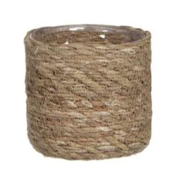 Naturel bruin kleur rotan planten pot mand van gedraaid jute/touw/riet/zeegras van 12 cm hoogte en 12 cm diameter(buitenzijde). Voor de binnenmaat trek je 2 cm af. Mooie rotan jute manden/mandjes voor bloemen, bloemstukjes en planten met plastic aan de binnenkant zodat het water er niet door gaat. De ronde rieten mand heeft geen gaatjes aan de onderkant.
