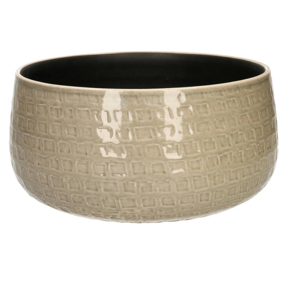 Plantenpot/bloempot schaal/bowl van keramiek in de kleur donkerbruin met een mooi relief patroon. Diameter 29 cm en hoogte 12 cm. Stijlvolle lage tafel bloempotten voor binnen gebruik met een glanzende finish. Serie: Floyd. Het prachtige gedrukte patroon aan de buitenzijde is met de hand gemaakt in Portugal. Derhalve is geen pot exact hetzelfde en hebben de bloempotten een echt karakter.