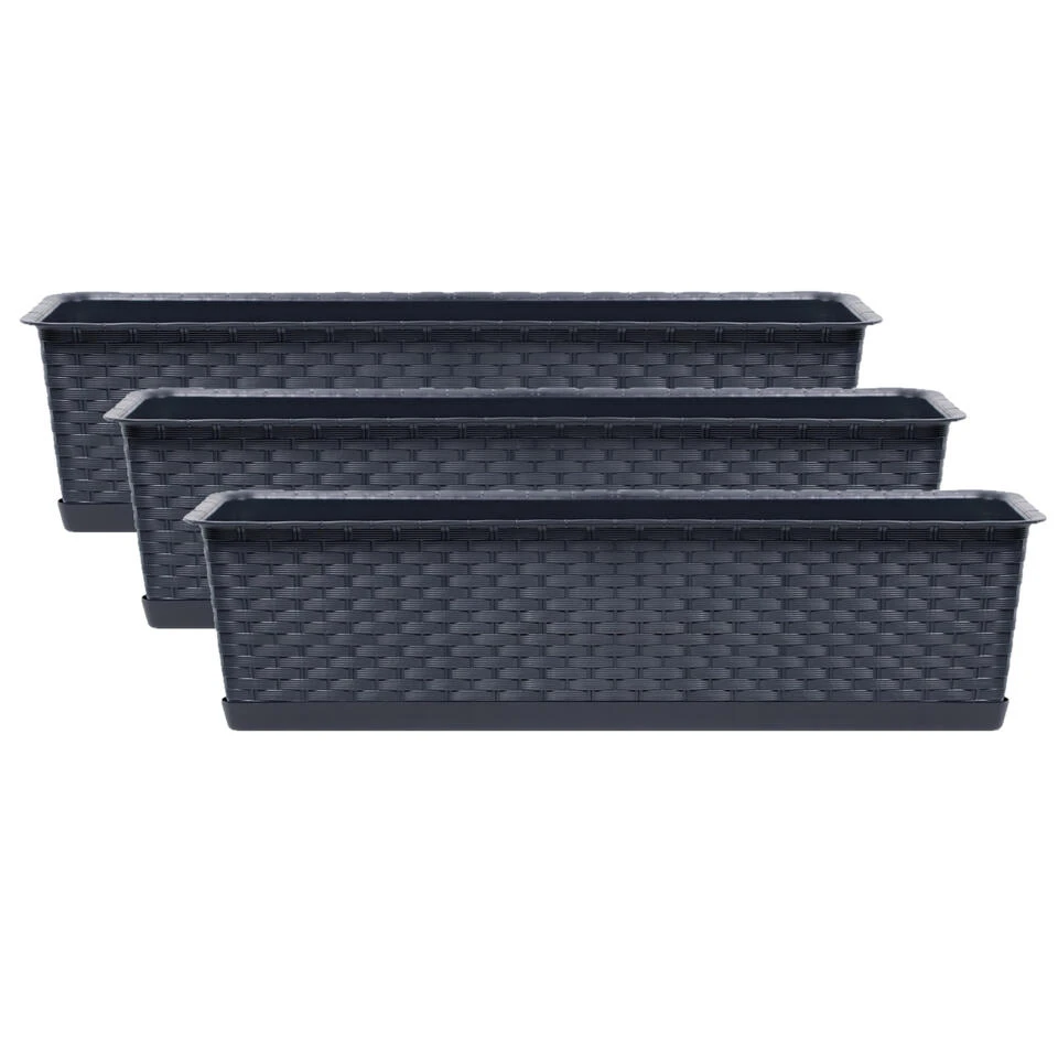 Kunststof Ratolla rotan plantenbak/bloembak/balkonbak set antraciet grijs 6.3 liter. Kras en stootvaste bloembak/plantenbak met rotan vlechtwerk uitstraling. Zonder afwateringsgaten, deze kunt u naar wens zelf maken. De bloembakken/plantenbakken zijn geschikt voor binnen en buiten gebruik. Serie: ratolla case. Formaat: lengte ca 39,1 cm. Breedte: ca 17,3 cm. Hoogte: ca 14,5 cm. Inhoud: 6,3 liter.