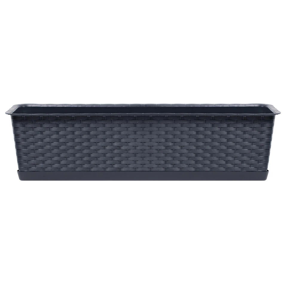 Kunststof Ratolla rotan plantenbak/bloembak/balkonbak set antraciet grijs 8 liter met bijpassende opvangschotel/opvangbak. Kras en stootvaste bloembak/plantenbak met rotan vlechtwerk uitstraling. Zonder afwateringsgaten, deze kunt u naar wens zelf maken. De bloembakken/plantenbakken zijn geschikt voor binnen en buiten gebruik. Serie: ratolla case. Formaat: lengte ca 50 cm. Breedte: ca 17,3 cm. Hoogte: ca 14,5 cm. Inhoud: 8 liter.