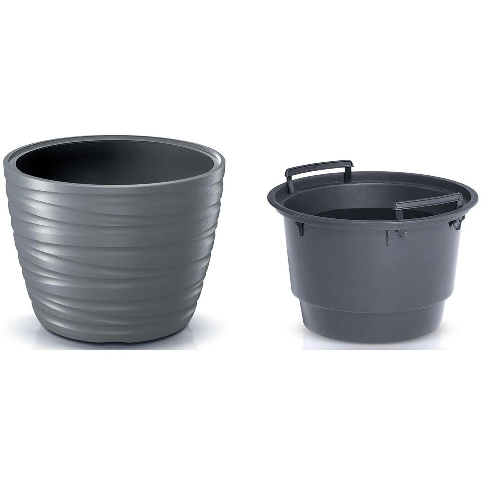 Plantenpot/bloempot uit de Amazing collectie is gemaakt van PP kunststof in de kleur steengrijs met een golvend strepen patroon aan de buitenzijde. Deze prachtige ronde bloempot is echt een schitterende toevoeging aan uw tuin/terras/huis. De bloempot is voor buiten en binnen gebruik geschikt en heeft een losse binnenpot met hendels. De kunststof constructie van de plantenpot maakt dat de pot licht van gewicht is, waardoor hij makkelijk is te verplaatsten. Formaat: Diameter 37 cm x Hoogte 28 cm. UV en vorst bestendig.