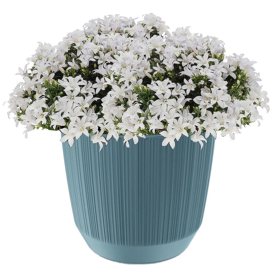 Moderne carf-stripe plantenpot/bloempot van kunststof met diameter 19.5 cm en hoogte 17 cm in het stone blauw. Geschikt voor buiten en binnen. Vorstbestendig ja. Basic plantenpotten voor in de tuin, balkon of binnen.