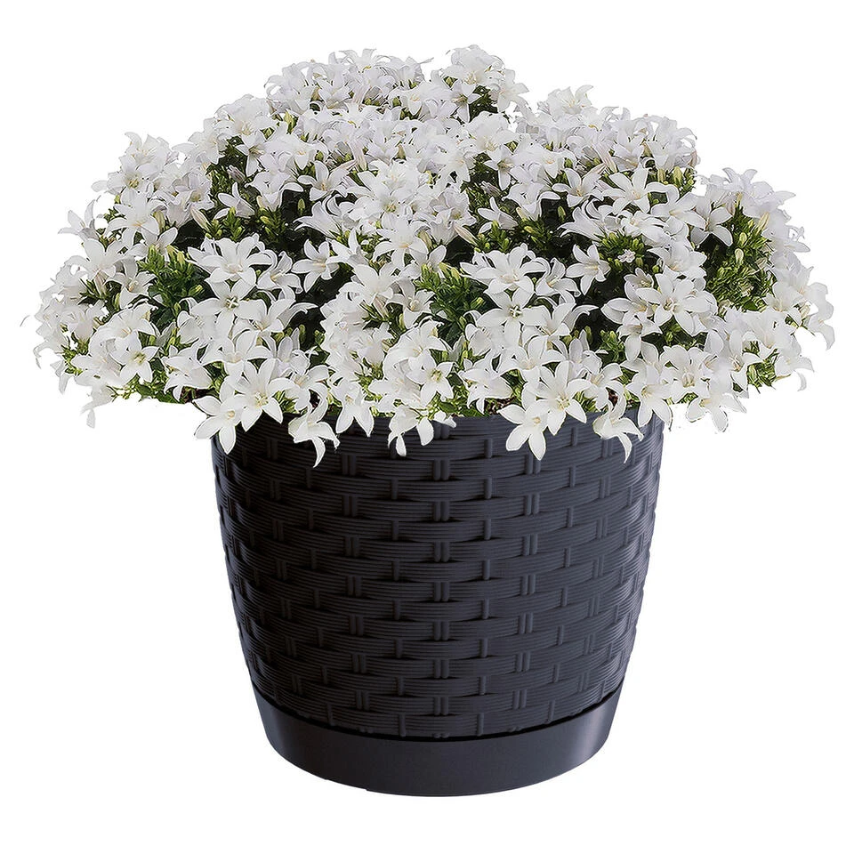 Ronde gevlochten plantenpot/bloempot kunststof dia 19 cm en hoogte 16.5 cm in het antraciet grijs. Vorstbestendig ja. Basic Ratolla plantenpotten voor in huis, tuin, serre of op het balkon. De pot is voorzien van een water opvangbak.