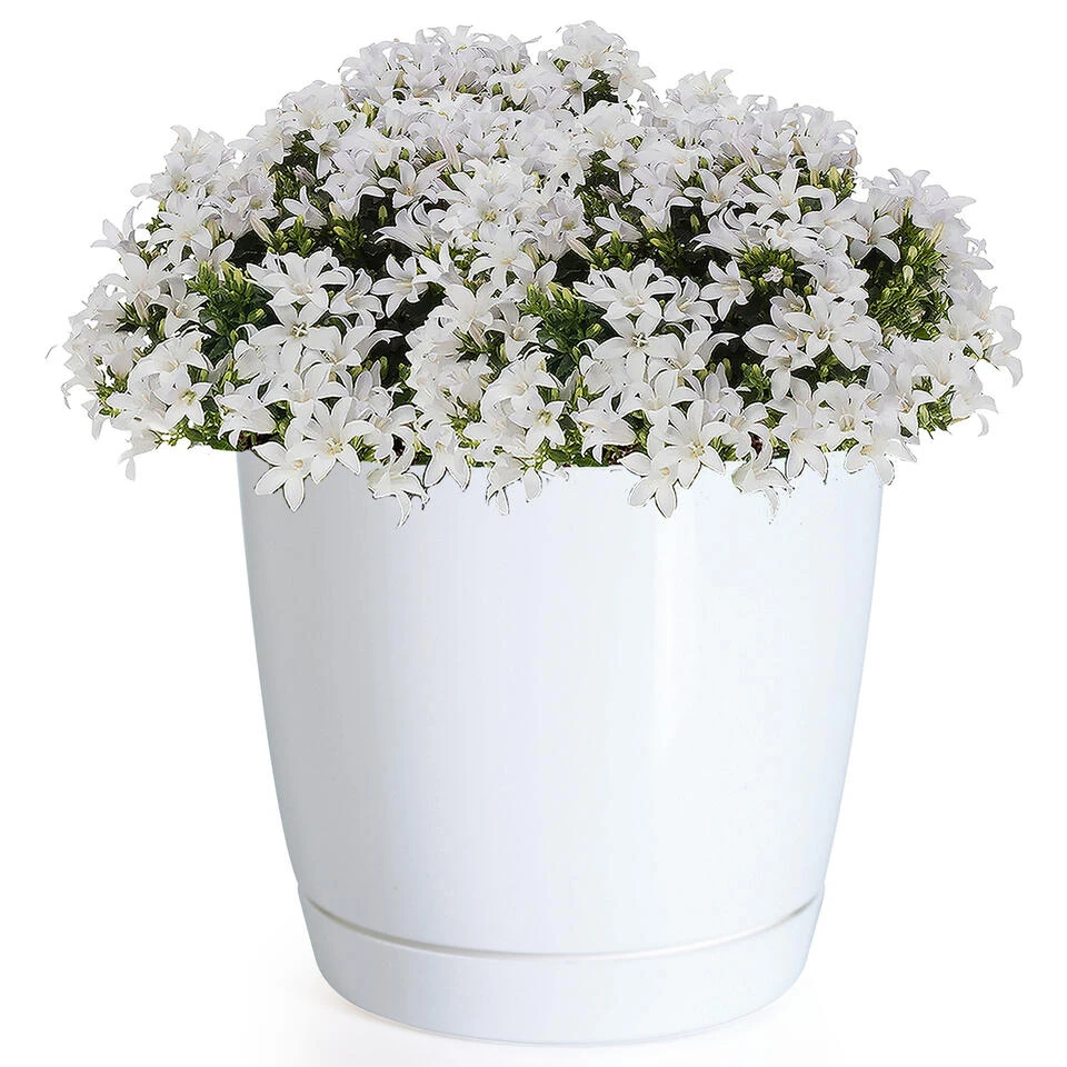 Plantenpot/bloempot kunststof rond glanzend parel wit dia 24 x hoogte 22 cm. Geschikt voor buiten en voornamelijk binnen. Vorstbestendig ja. Mooie stralende plantenpotten voor in de tuin, serre, balkon of binnen. Met overtollig water opvangbak voor makkelijker binnen gebruik.