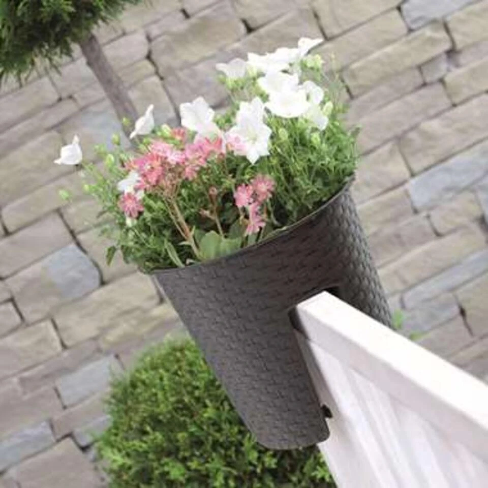 1x Kunststof Ratolla rotan balkon plantenpotten/bloempotten antraciet 6 liter. Serie: ratolla railing. Kras en stootvaste bloempot/plantenbak met rotanvlechtwerk uitstraling, zonder gaten. Afgeronde doos voor montage op leuningen en balustrades. Formaat: lengte ca 29,8 cm. Breedte ca 24,2 cm. Hoogte ca 22,5 cm. Inhoud: 6 liter. Materiaal: kunststof. Geschikt voor binnen en buiten gebruik. Tuin en balkon decoratie plantenpot/bloempot.