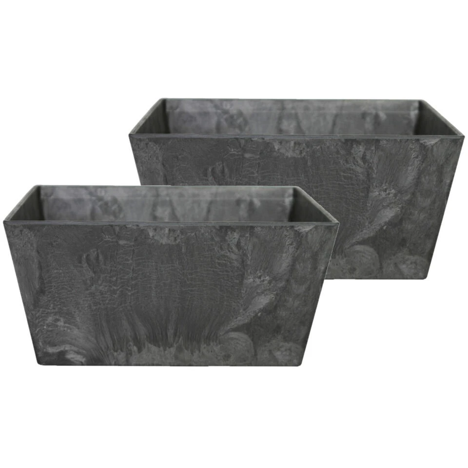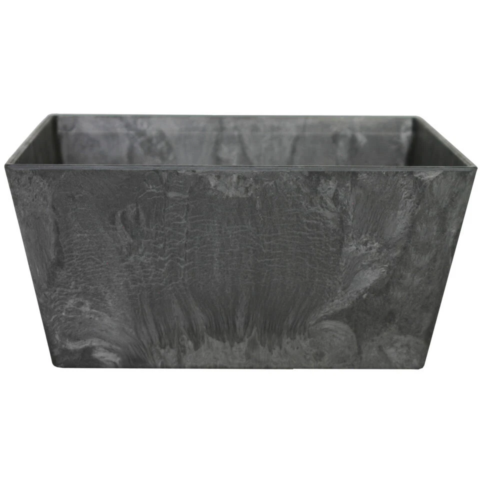 Bloempot/plantenpot rechthoekig balkonbak van gerecycled kunststof en steenpoeder in de kleur zwart/betonlook met diameter 25 cm en hoogte 12 cm. Artstone Ella serie potten voor buitenplanten, binnenplanten of kunstplanten. Een unieke duurzame mix van materialen dat nu geen afval is, maar een prachtige duurzame bloempot, 100% recyclebaar. Deze serie potten hebben een eigen drainagesysteem onderin de pot met water plug zodat ze geschikt zijn voor binnen en buiten.