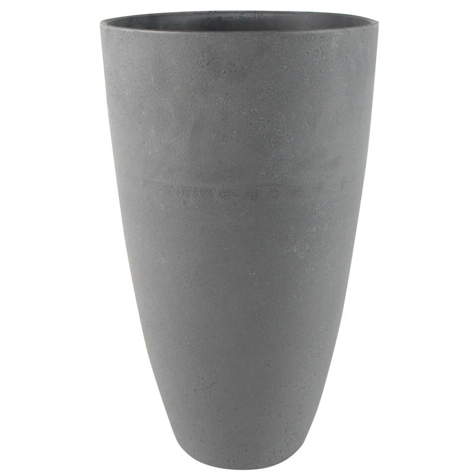 Hoge bloempot/plantenpot of vaas van gerecycled kunststof en steenpoeder in de kleur donkergrijs met diameter 29 cm en hoogte 50 cm. Potten/vazen voor kamerplanten, buitenplanten, bloemen of kunstplanten. Deze bleoemenvaas/pot voor binnen en buiten heeft een stijlvolle uitstraling in elk interieur. Een unieke duurzame mix van materialen dat nu geen afval is, maar een prachtige duurzame bloempot. Een sterke, mooie pot die vriendelijk is voor het milieu en de portemonnee. De pot/vaas heeft gaatjes in de onderkant dus een opvangschaal is voor binnen gebruik vereist. Zoeknaam serie voor de schaal is Nova concrete donkergrijs. Deze serie potten hebben een eigen drainagesysteem onderin de pot.