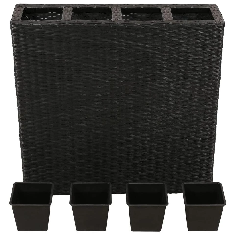 Deze plantenbak is gemaakt van duurzaam, waterbestendig rattan en is de perfecte aanvulling op je buitenruimte. De strakke weefstructuur zorgt voor een gladde afwerking en goede stabiliteit. De plantenset bestaat uit 4 kunststof potten waardoor de set een lange levensduur heeft. Je kunt allerlei levendige groene planten en bloemen netjes in de potten plaatsen. De levering bevat 1 plantenbak en 4 verwijderbare potten met dezelfde afmetingen.